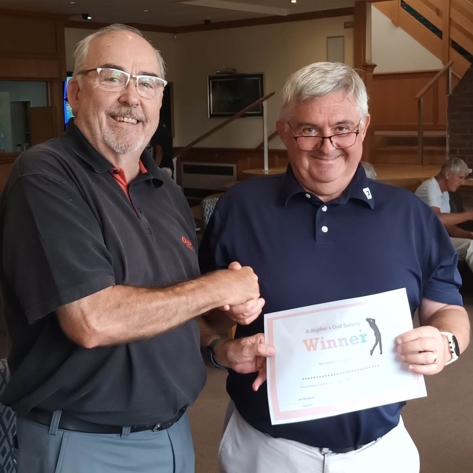 Terry Porter (R) collects his winners voucher from skipper Ian Horsham